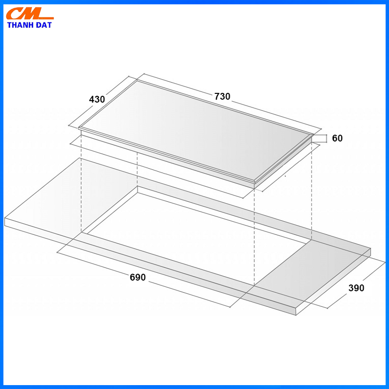 - Kích thước mặt kính: R730 x S430 x C60 (mm)