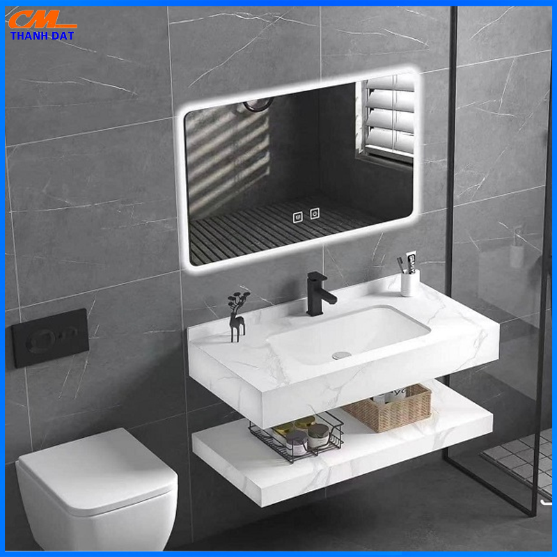 Đặt mua Bộ bàn đá 2 tầng chậu rửa lavabo đá nhân tạo màu vân mây trắng