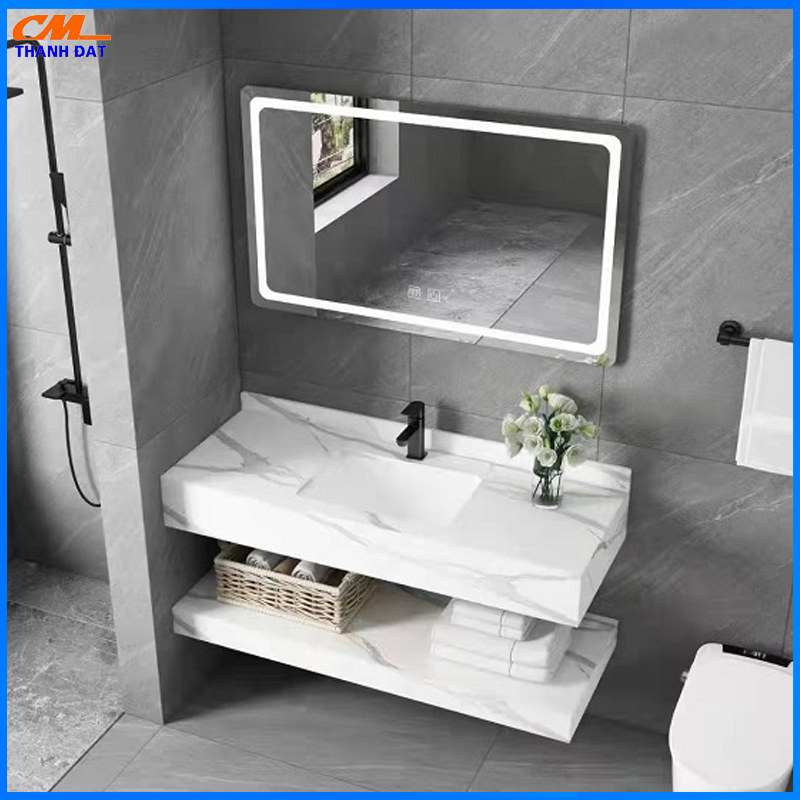 Sản phẩm bao gồm: Mặt bàn đá, chậu rửa, gương đèn Led, giá đỡ Inox