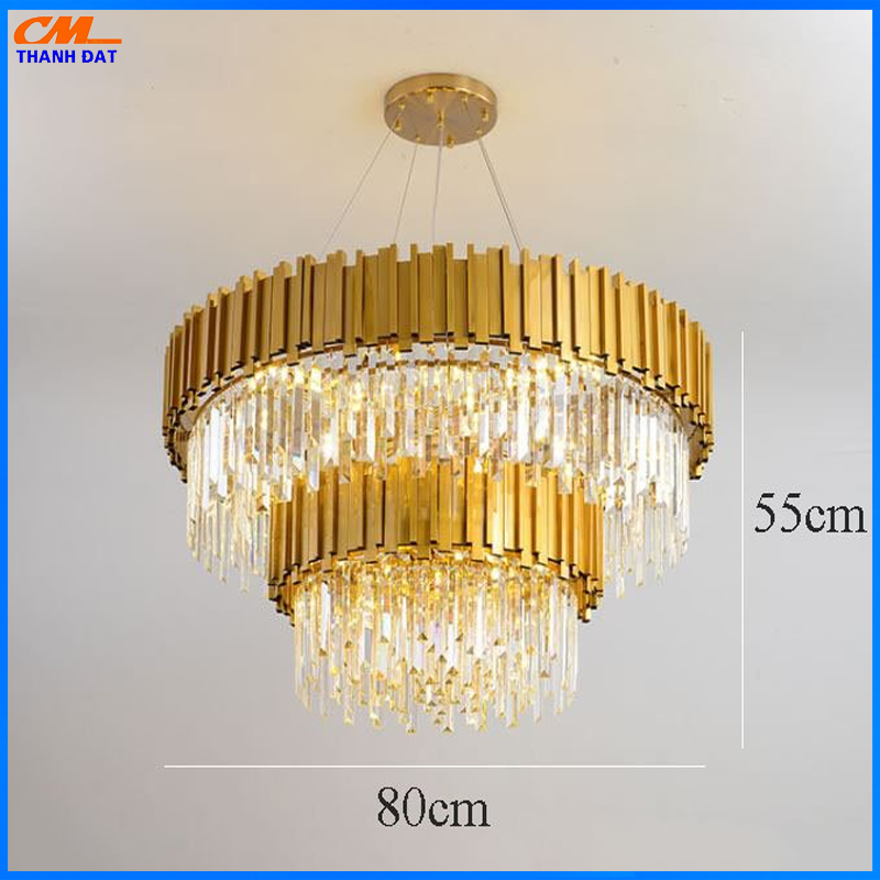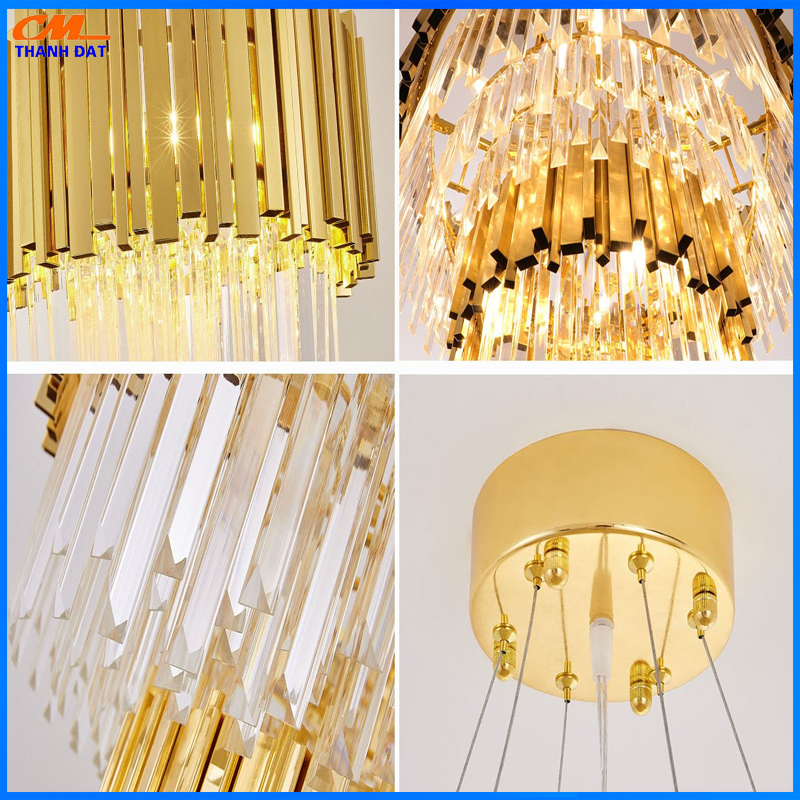 Bên dưới là rất nhiều những thanh pha lê dài lấp lánh mang nét kiêu sa, lộng lẫy. Những thanh pha lê phản chiếu ánh sáng từ đèn sẽ tạo nên một không gian vô cùng tuyệt đẹp.