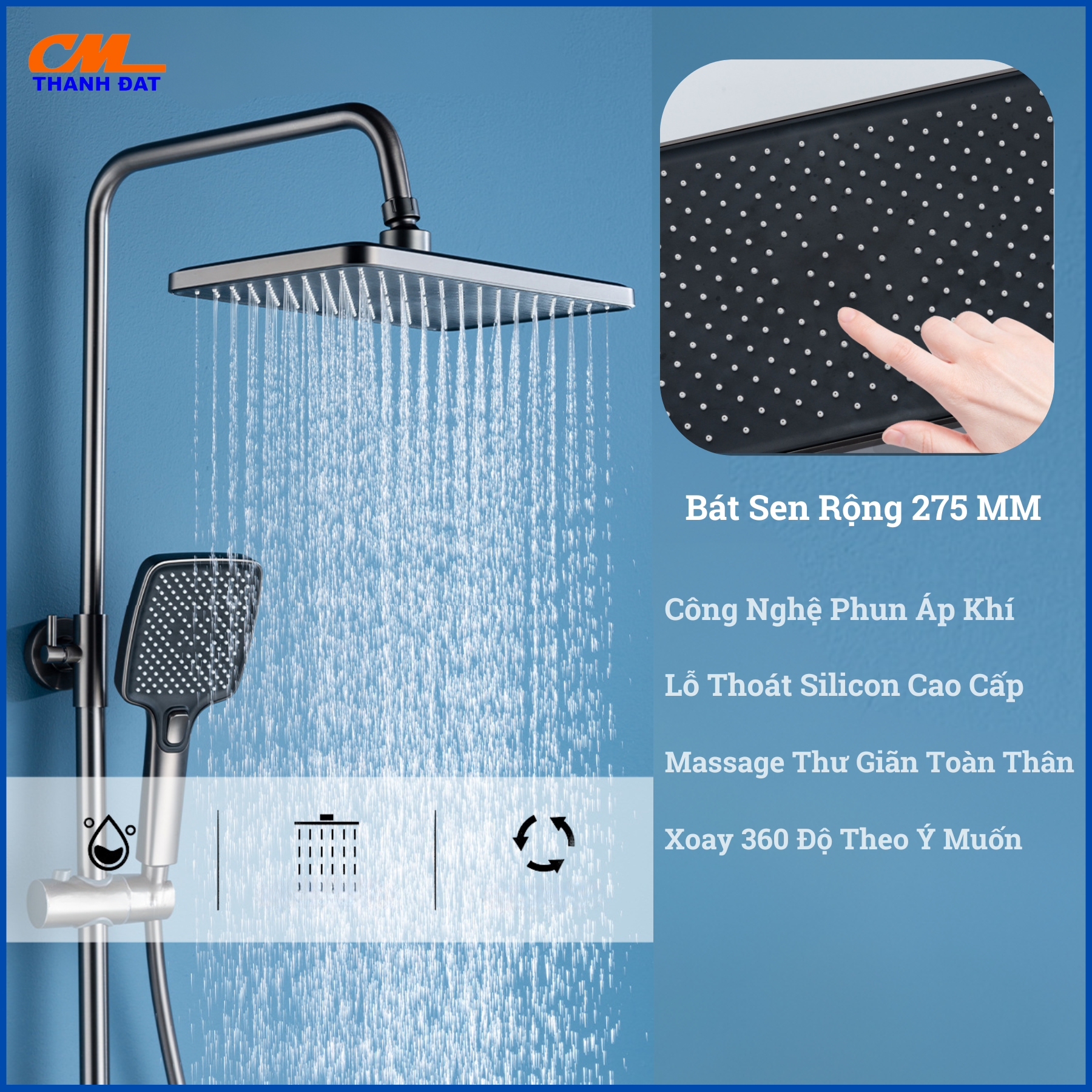 - Bát sen với diện tích phun nước rộng lên tới 275mm và khả năng xoay linh hoạt 360 độ, mang đến cho bạn một trải nghiệm thư giãn toàn thân và giải tỏa căng thẳng tuyệt vời.