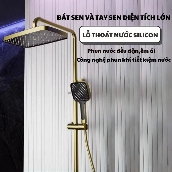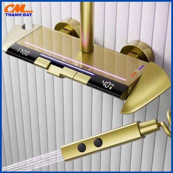 – Chất liệu: Đồng thau mạ titan mặt kính cường lực và hiển thị nhiệt độ, thời gian, đèn led dải trên thân củ sen tắm.