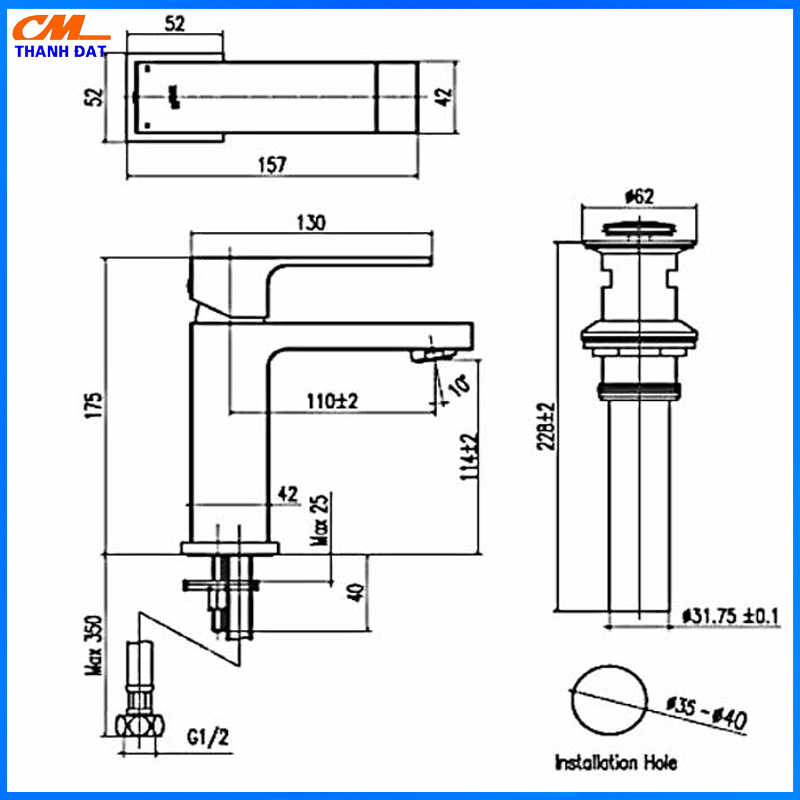 - Áp lực nước: 0.05 MPa ~ 0.75 MPa